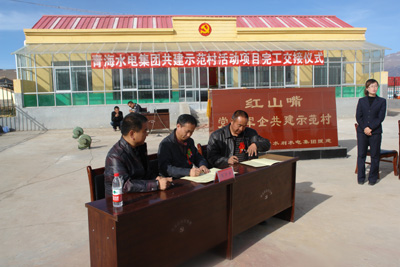 在交接儀式上,董金明書記等領導對聯(lián)建項目給予了高度的評價,并對青海水電集團領導多次深入村莊調查研究、了解村情民意,根據(jù)村莊發(fā)展長遠規(guī)劃,從實際需求出發(fā)制定聯(lián)建項目等一系列做法表示崇高的敬意和衷心的感謝。同時,他希望兩村村民借助聯(lián)建的強大動力,進一步加大改善村容、環(huán)境衛(wèi)生等工作,維護好、管理好聯(lián)建項目設施。尹京輝同志在致辭中表示,全縣群眾將永遠銘記黨和政府的恩情,不辜負黨和政府給予的各項惠農(nóng)政策,艱苦創(chuàng)業(yè),勤勤懇懇、安居樂業(yè),為建設社會主義新農(nóng)村,維護青海社會穩(wěn)定,經(jīng)濟發(fā)展做出貢獻。青海水電集團計劃投資部副部長李宏緒和紅山嘴村代表以及監(jiān)交方青石嘴鎮(zhèn)政府領導簽訂了交接協(xié)議書。村民代表向青海水電集團贈送了致謝錦旗。