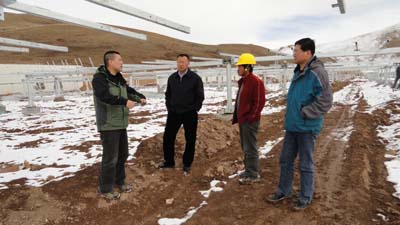 王總經(jīng)理抵達(dá)玉樹后,首先前往金太陽2兆瓦水光互補(bǔ)發(fā)電項(xiàng)目工地,對(duì)工程形象進(jìn)度、設(shè)備到貨及安裝就位、職工生活情況,特別是目前工程建設(shè)所面臨的困難等做了全面深入的了解。王總經(jīng)理要求青海玉能電力開發(fā)有限公司克服氣候寒冷等不利因素,合理調(diào)配資源,增加安裝施工人員,保證各類材料設(shè)備及時(shí)到貨,加快項(xiàng)目建設(shè)進(jìn)度,確保實(shí)現(xiàn)年底投產(chǎn)發(fā)電目標(biāo)。隨后,王總經(jīng)理一行又來到禪古水電站大壩檢查,詳細(xì)詢問了庫區(qū)來水情況,要求玉樹電力公司高度重視水庫運(yùn)行和安全保障工作。