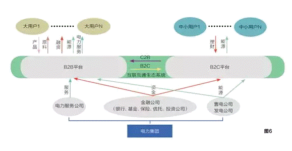 為充分利用互聯(lián)網(wǎng)的零距離、零時(shí)差的資源共享優(yōu)勢,在建立中小電力用戶的B2C平臺以及與大用戶之間的B2B平臺后,通過C2B對兩個(gè)平臺進(jìn)行融合,以金融為核心,以供應(yīng)鏈為紐帶,以能源服務(wù)為支持,構(gòu)建融合多產(chǎn)業(yè)的互聯(lián)互通生態(tài)系統(tǒng)。(見圖6)