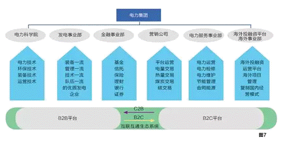 以發(fā)電業(yè)務(wù)為基礎(chǔ),以金融業(yè)務(wù)為核心,以電力營銷為龍頭,以電力科研和電力服務(wù)為支撐,構(gòu)建全球化互聯(lián)互通生態(tài)系統(tǒng)。(見圖7)